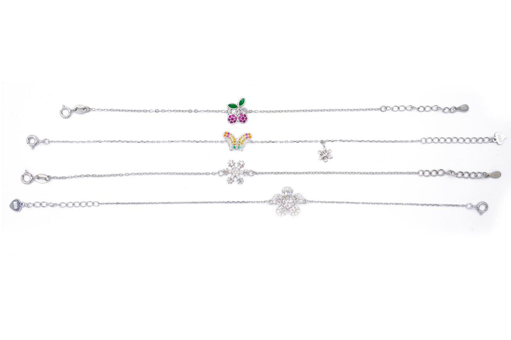 Aggiungi un tocco di dolcezza al tuo look con il BRACCIALE MIX in ARGENTO 925. Il bracciale presenta una serie di soggetti adorabili, come ciliege, fiocchi di neve, farfalle e fiori. Perfetto per un look divertente e giocoso.