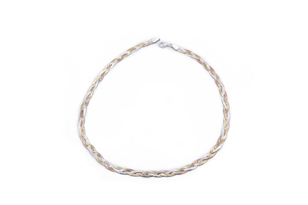 Avventurati nei tuoi look con la COLLANA INTRECCIO! Realizzata in argento 925, la sua trama a tre colori (rodio, oro e rosa) evoca audacia e stile. Aggiungi un tocco di diversità ai tuoi outfit con questa collana versatile e di tendenza.