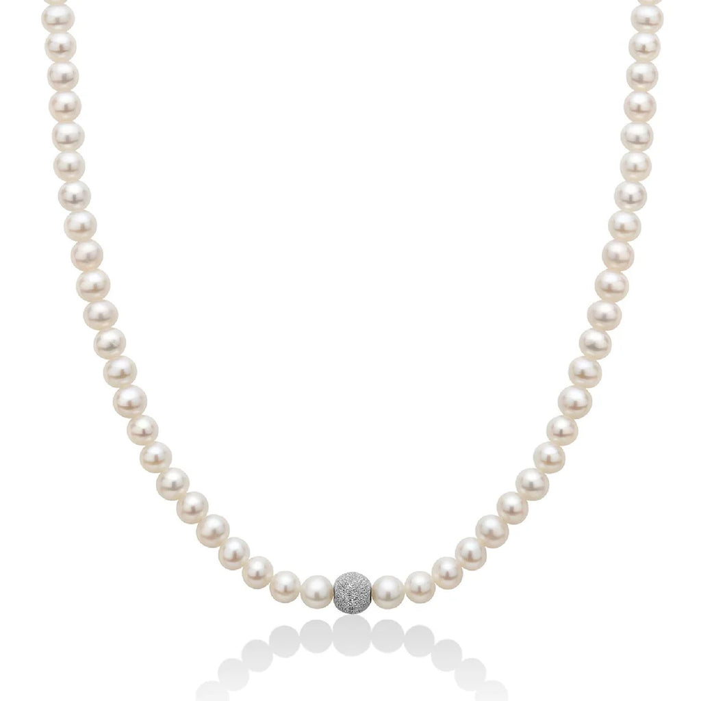 Collana di perle Oriente con sfera centrale in oro bianco diamantata.