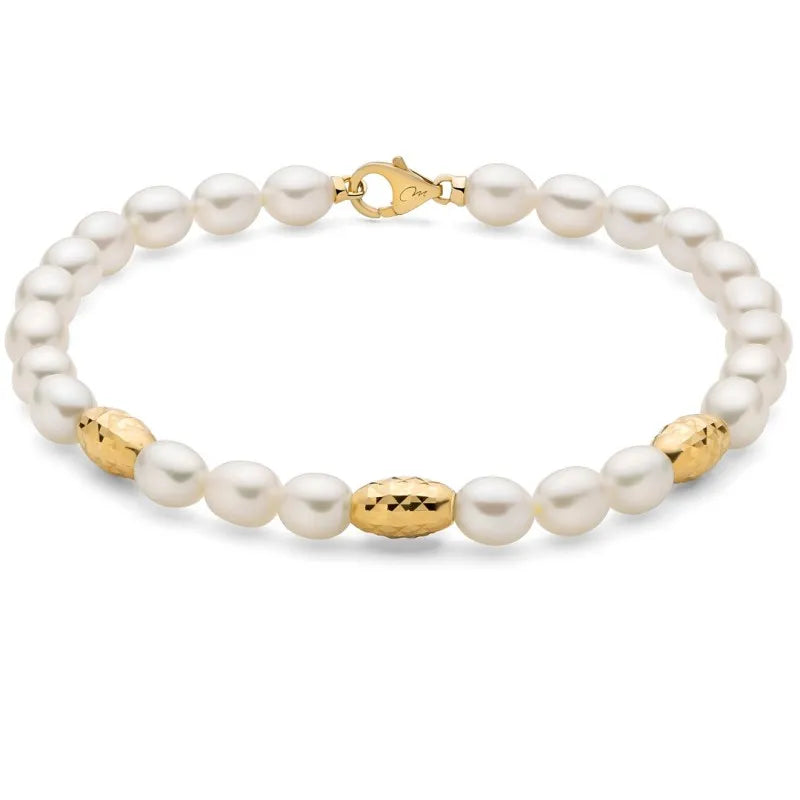 Gioiello da Donna MILUNA della collezione PEPITE DI PERLE - Il bracciale, caratterizzato da un filo di perle bianche coltivate di acqua dolce dal diametro di 5-5,5 mm, è impreziosito con tre boule ovali, finitura diamantata, in argento 925 placcatura oro giallo - Lunghezza Bracciale: 18 cm + Chiusura con moschettone in argento 925 placcatura oro giallo