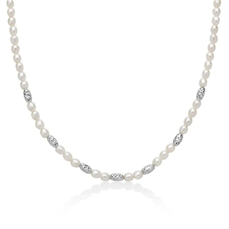 Gioiello da Donna MILUNA della collezione PEPITE DI PERLE - La collana, caratterizzata da un filo di perle bianche coltivate di acqua dolce dal diametro di 4-4,5 mm, è impreziosita con sette boule ovali, finitura diamantata, in argento 925 placcatura rodio silver - Lunghezza Collana: 40 cm + Chiusura con moschettone in argento 925 placcatura rodio silver.