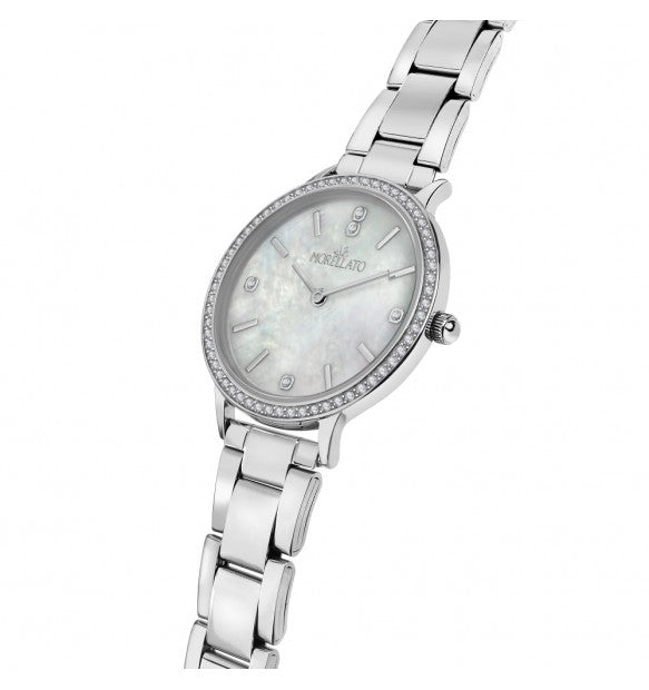 Cassa rotonda in acciaio inox dal diametro di 32 mm. Lunetta impreziosita da zirconi bianchi.
