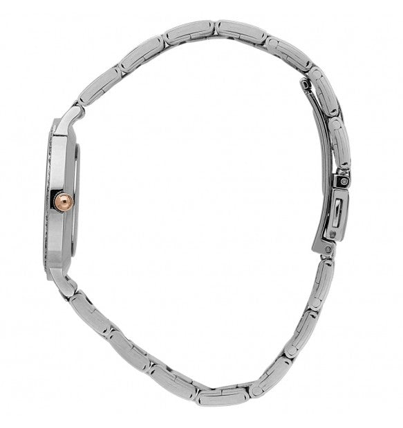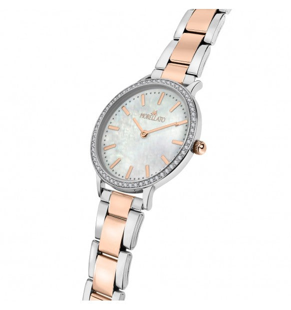 Cinturino bicolore in acciaio anallergico silver e rose gold; chiusura deployante con pulsanti.