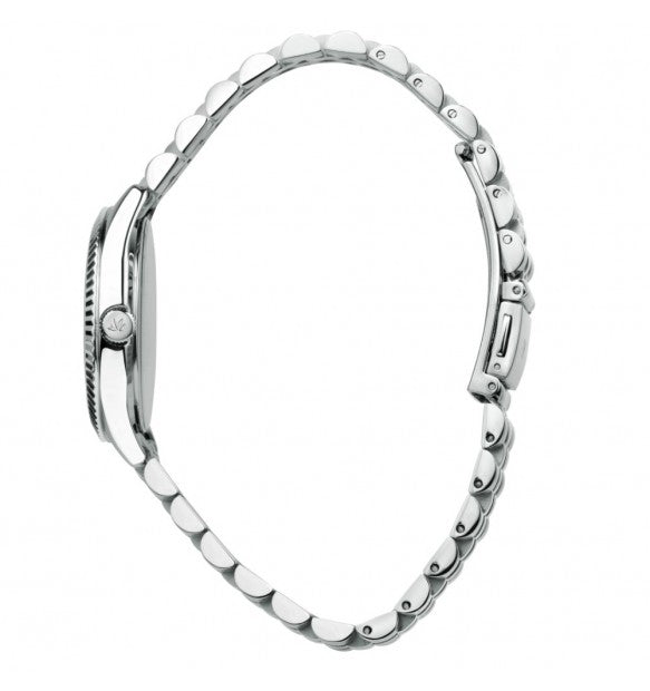 Cinturino in acciaio anallergico color argento; chiusura deployante con pulsanti.