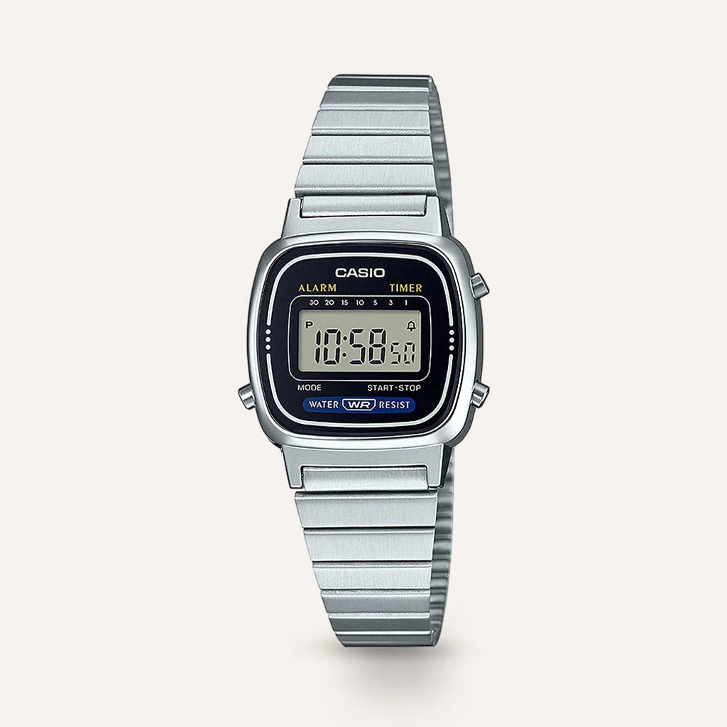 Orologio Casio, collezione:Casio collection, caratteristiche: funzioni cronometro - 1/10 sec - 1 ora tempo trascorso, tempo intermedio e tempo finale sono misurati con una precisione di 1/10 di secondo. L'orologio è in grado di misurare fino ad un'ora. 7 preset timer (fino a 30 min. ) il preset timer prevede sette tempi di gioco predefiniti per diversi sport, richiamabili quando necessario. Allo scadere di un tempo di gioco suona un allarme e l'orologio ricomincia a contare automaticamente a partire dal tempo preimpostato. Il tempo di misurazione può arrivare fino a 30 minuti. Allarme giornaliero l'allarme giornaliero ricorda eventi che si ripetono quotidianamente con un segnale acustico emesso all'ora preimpostata. Calendario automatico una volta impostato, il calendario automatico visualizza sempre la data esatta. Cassa in resina cromata. 2 anni - 1 batteria la batteria alimenta l'orologio per ca. 2 anni. Classificazione di impermeabilità (wr) a norma iso 22810questo modello è impermeabile a norma din 8310 e/o iso 22810, sopporta quindi spruzzi leggeri. Evitare un contatto con una quantità maggiore di acqua. Accuratezza+/- 30 sec secondi al mese tipo di pilacr1216 dimensionica. 30,3mm x 24,6mm x 7,3mm (a x l x p) pesoca. 10,4 g, referenza:la670wega-1ef