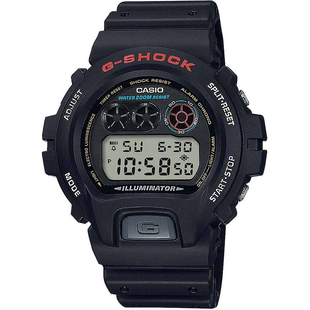 Orologio da uomo del brand G-Shock. Super illuminazione, Antiurto, Lampeggio display, Cronometro - 1/100 sec - 24 ore, Timer - 1/1 sec. - 24 ore (con ripet. automatica), sveglia multifunzione, segnale orario, calendario automatico, Formato 12/24 ore, vetro minerale, cassa di resina sostenibile, bracciale in resina sostenibile, Fibbia, 5 anni - 1 batteria, Classificazione di impermeabilità (20 bar). La referenza è: DW-6900U-1ER.