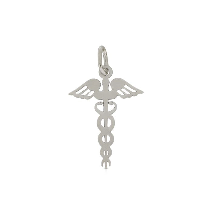 Questo pendente alato a forma di bastone è realizzato in oro bianco e raffigura un simbolo delle professioni sanitarie. Misura Cm 1,60x2,20 e può essere indossato come segno di riconoscimento e onore per chi lavora nel campo medico. Unico e prezioso, simboleggia la dedizione e la professionalità nel fornire cure di alta qualità.