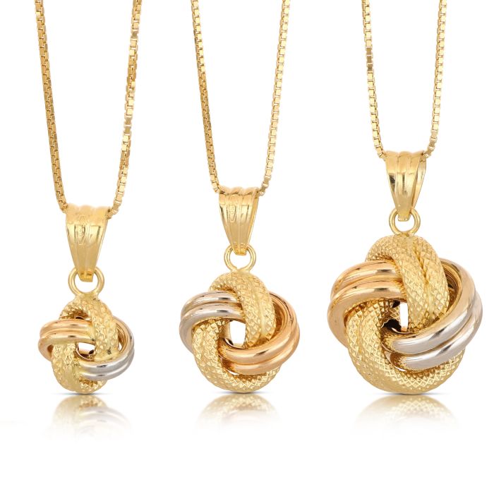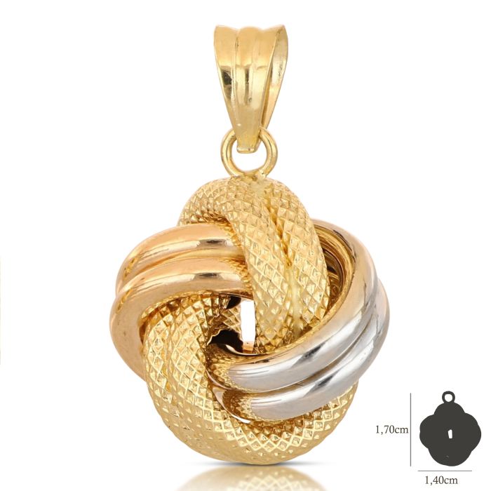 Questo pendente nodo in oro 18kt unisce con eleganza tre tonalità preziose: giallo, rosa e bianco. Il design raffinato simboleggia l’unione e l’armonia, rendendolo un gioiello sofisticato e versatile, perfetto per arricchire ogni look con un tocco di classe senza tempo.