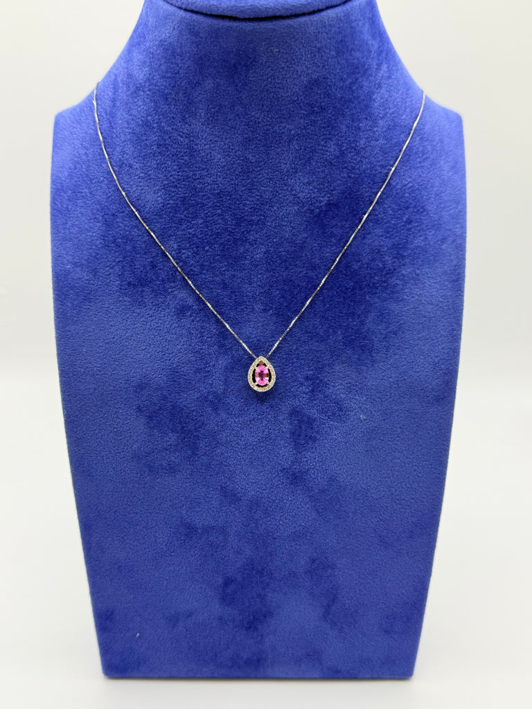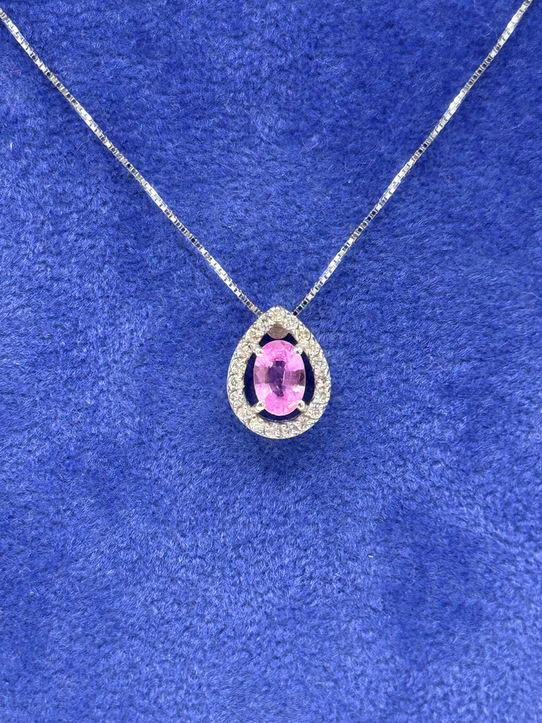 Eleganza che cattura lo sguardo: questa collana in oro bianco 18 kt racchiude un delicato zaffiro da 0,54 ct circondato da 19 brillanti diamanti (0,13 ct totali). Una goccia di lusso che danza sul collo, perfetta per chi ama il sofisticato con un tocco di magia. Ogni indosso è una piccola celebrazione di stile e raffinatezza.